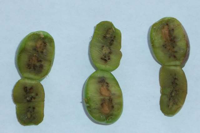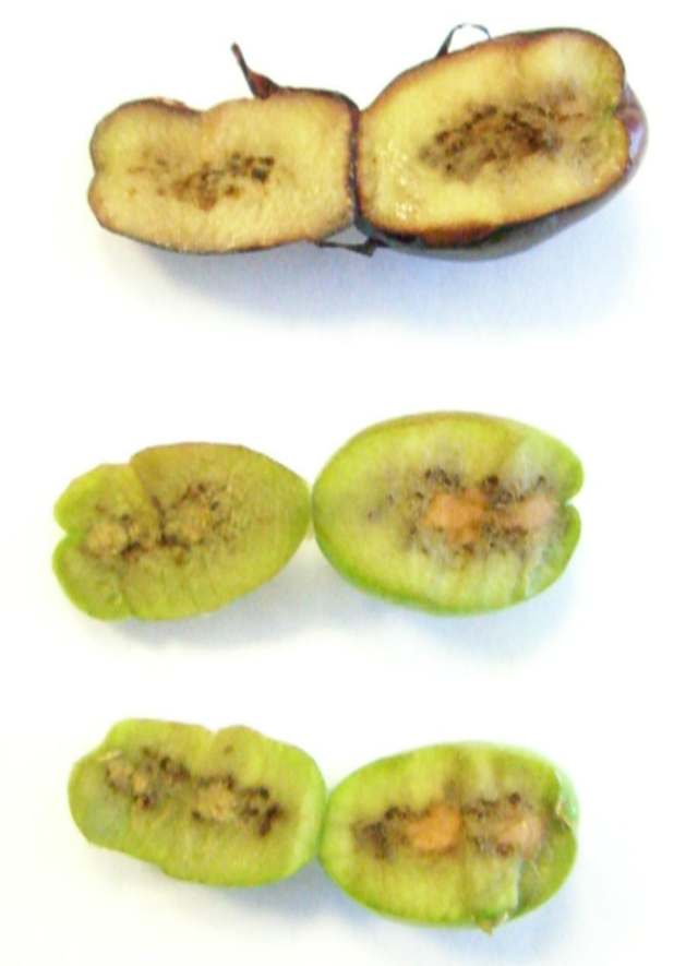 CONSULTA: a ver quien me puede ayudar. En una finca hay olivos aislados que se les cae la hoja y la aceituna. Aparentemente el fruto no tiene nada, pero al cortarlo con la navaja, se observan como galerias o algo asi, alrededor del hueso. Lo bueno es que no se ve orificio de entrada ni salida, como en el prays o mosca. Otro me ha dicho que puede ser un hongo, pero no conozco ningun hongo asi. Alguien sabe lo que es esto Adjunto dos fotos del fruto.