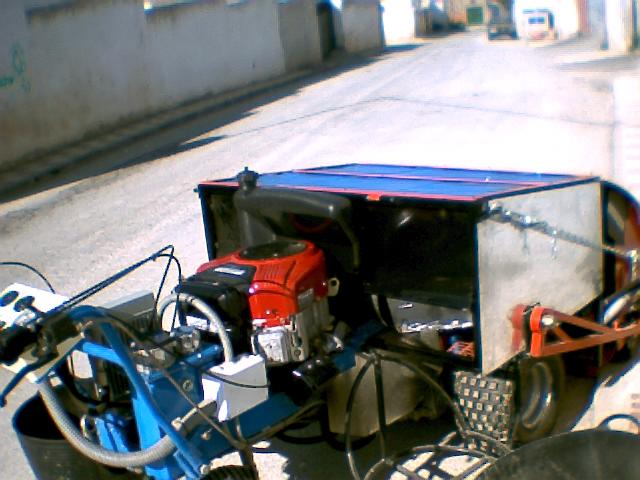 Lleva motor con arranque eléctrico de 18 CV., caja de cambios hidrostática, rueda superancha para que tenga bastante agarre y la aceituna limpia sale a dos esportones de goma. Muy manejable. Buen precio.