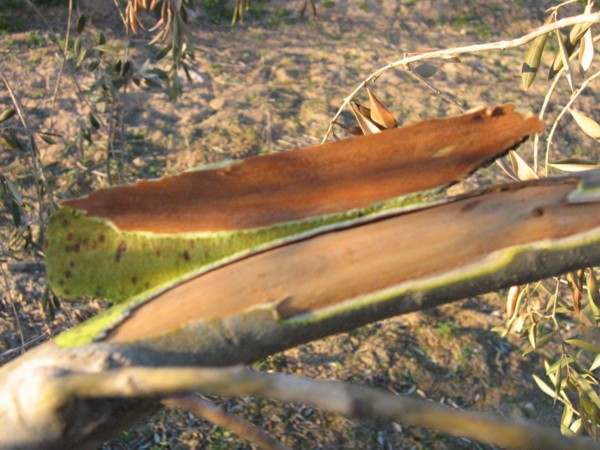 CONSULTA: Envío fotos de unos síntomas que me he encontrado en una parcela de olivos. Creo que puede tratarse de Verticillium pero no estoy segura. Me explico un poco; hace un mes aproximadamente fuí a ver los olivos que al parecer tenían algunas hojas secas que se caían, observé que tenían bastante daños de Euzophera pinguis y ese fué mi diagnóstico. Pero los árboles han dado un cambio muy significante, se están secando ramas completas, la corteza de las ramas tienen una tonalidad rojiza (dorada) y la corteza de la madera se desprende con facilidad y con color marrón.