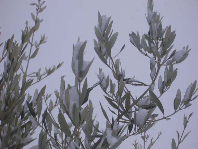 - Da pistas, no digo verbales pero al menos podías colgar más fotos con más perpectiva, montañas o llanos nevados, mas mundo....pero un olivo deformado por el peso de la nieve, en un paisaje semiurbano igual a otros cuatro mil, y un primer plano de unas ramas sobre un fordo de nieve blanco ...es mucha tela para averiguar la variedad y el lugar....Esto no es un pasatiempos, es una tortura china colega.